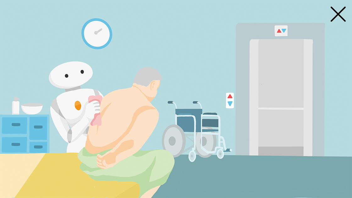 Dry-AIRECが適切な身体部位に両手をアプローチして、ベッド上での無理のない起き上がり支援を行っている様子です。今後は実際の人を対象に技術検証を行う予定です。